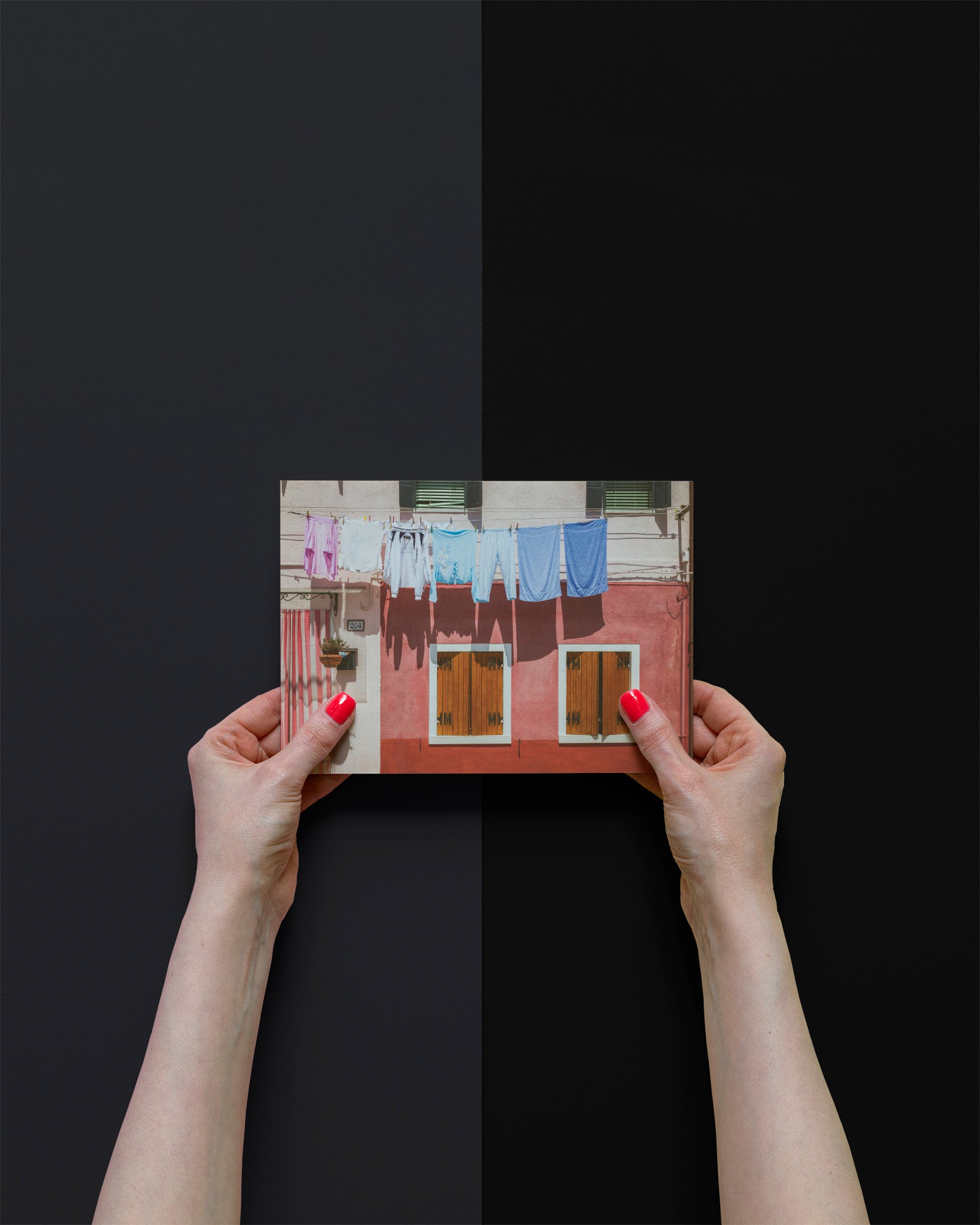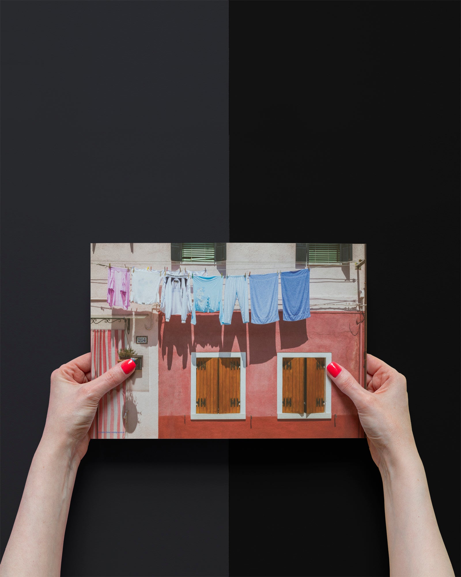 Washing hanging up to dry in the sunshine sits in front of a salmon pink house with wooden shutters on the island of Burano, Italy.